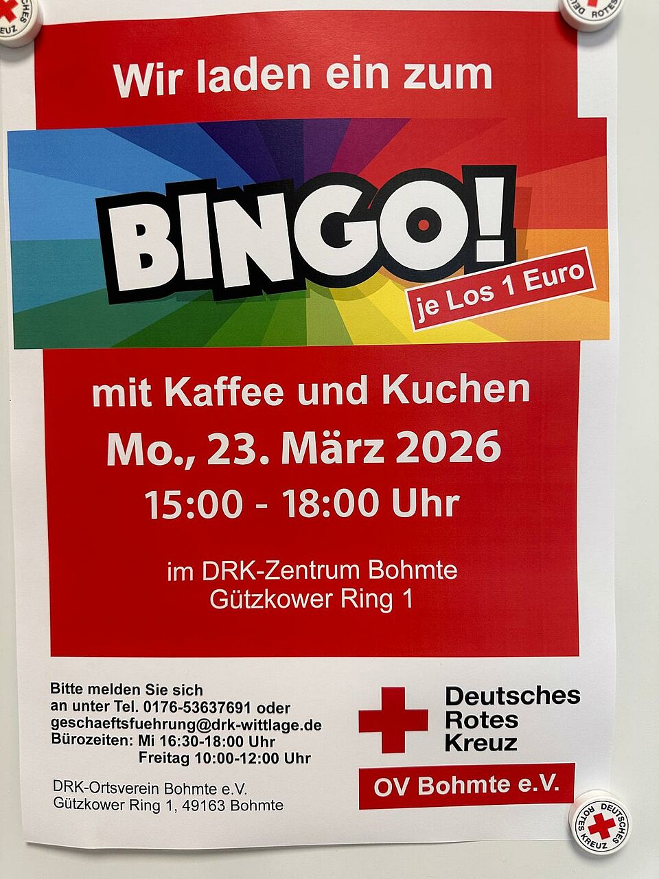 Am 23.03.2026 veranstaltet das DRK Bohmte den nächsten Bingo-Nachmittag. Beginn ist um 15:00 Uhr und soll gegen 18:00 Uhr enden. Wir freuen uns auf viele Teilnehmer. Kaffee und Kuchen wird ebenfalls angeboten. Verbringen Sie ein paar schöne Stunden in geselliger Runde.