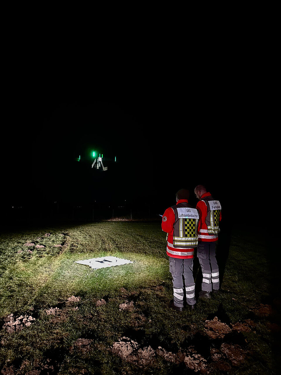 Das realitätsnahe Szenario sah vor, zwei vermisste Personen nach einem Verkehrsunfall an dem angrenzenden weitläufigen Gelände des Flugplatzes aufzuspüren. Gerade in den Abendstunden und bei schwierigen Lichtverhältnissen stoßen herkömmliche Suchmaßnahmen schnell an ihre Grenzen. Hier kam die moderne Drohnentechnik zum Einsatz: Ausgestattet mit einer hochauflösenden Wärmebildkamera überflog die Drohne systematisch das ca 1,5km² Suchgebiet.