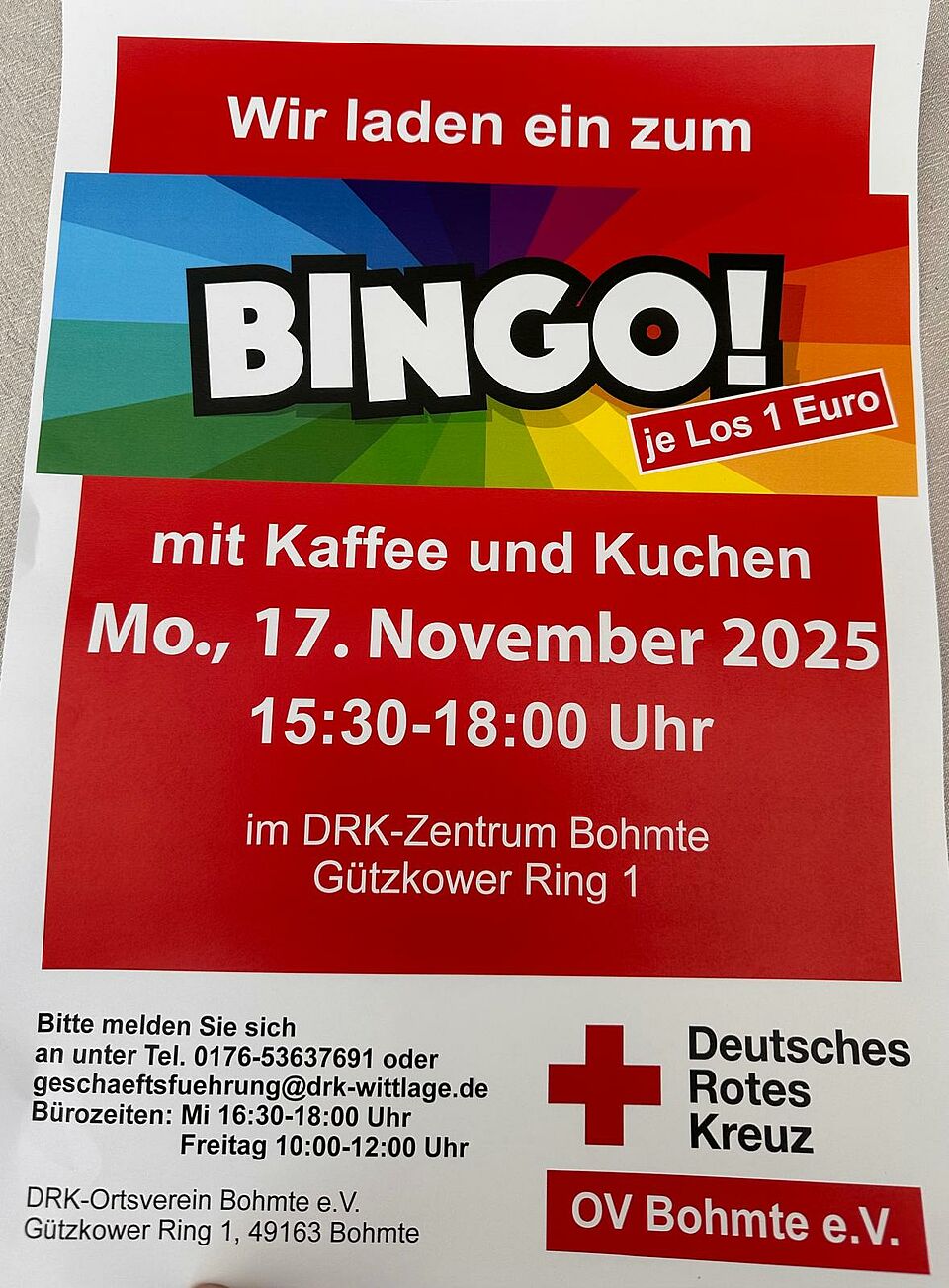 Am 17.11.2025 veranstaltet das DRK Bohmte den nächsten Bingo-Termin. Beginn ist um 15:30 Uhr und soll gegen 18:00 Uhr enden. Wir freuen uns auf viele Teilnehmer. Kaffee und Kuchen wird ebenfalls angeboten. Verbringen Sie ein paar schöne Stunden in geselliger Runde.